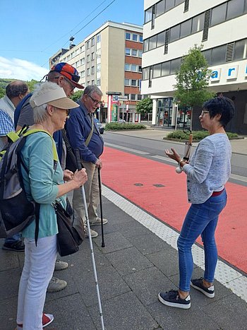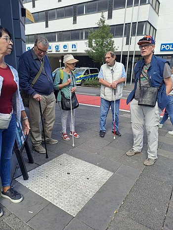 Wenn Theorie auf praktische Übungen trifft, ist die Enttäuschung in Hagen vorprogrammiert. Die Bodenindikatoren waren zwar vorhanden und Kerstin hatte einen Langstock dabei, den diejenigen, die noch keinen Langstock in der Hand hielten, nutzen konnten. So konnte man die Leitstreifen fühlen. Allerdings erklärte Kerstin, dass viele dieser Bodenindikatoren nicht den Normen entsprechen.